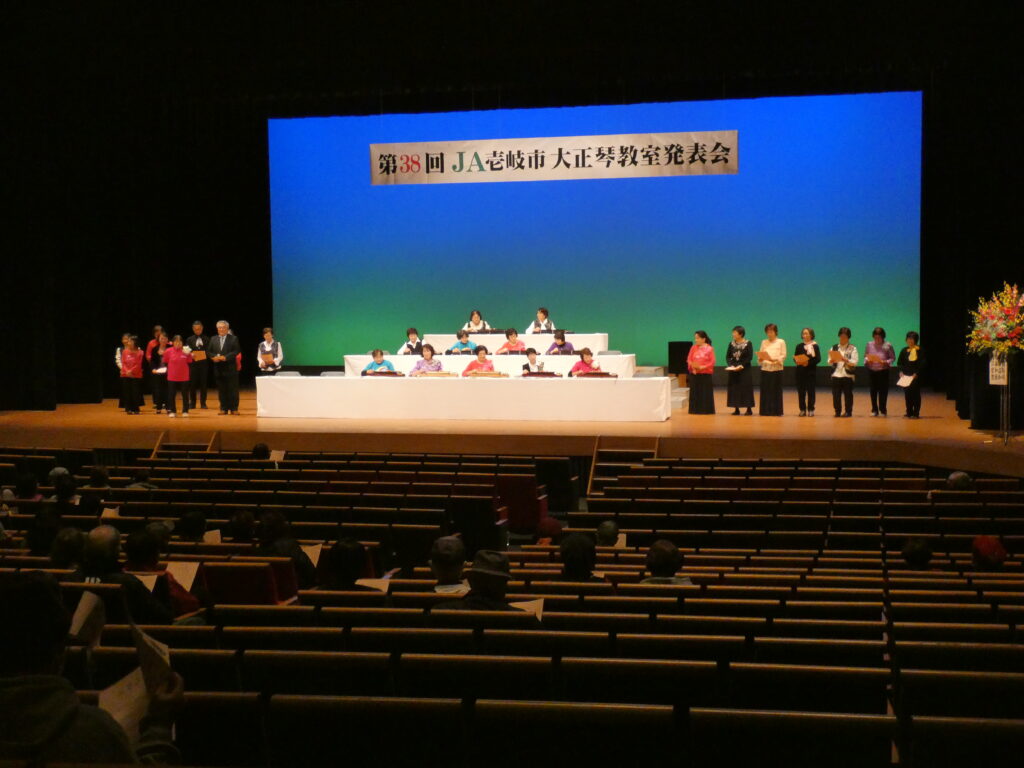 JA壱岐市大正琴教室(豊坂加代子会長)は12月7日、郷ノ浦町の壱岐の島ホールで第38回発表会を開きました。女性部のOBを中心に9教室75名が日頃の練習の成果を披露しました。色鮮やかな衣装を身につけ昭和の名曲を中心に13グループが36曲を演奏、4種の大正琴(ソプラノ、アルト、テナー、ベース)が奏でるアンサンブルが観客を魅了しました。最後は会場全員で「ふるさと」を熱唱し38回大会を閉めました。