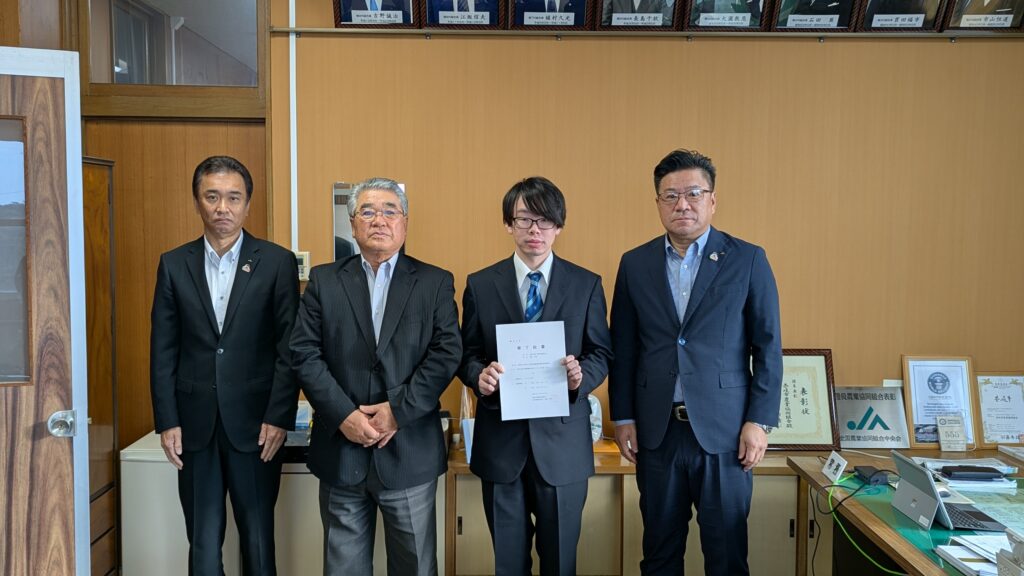 同JAの川﨑裕司組合長は「研修を終えた高尾さんには、受入農家や地域の皆様への感謝を忘れず邁進してほしい。農業はすべて自己責任、しっかり経営者になって頑張っていただきたい」と激励しました。