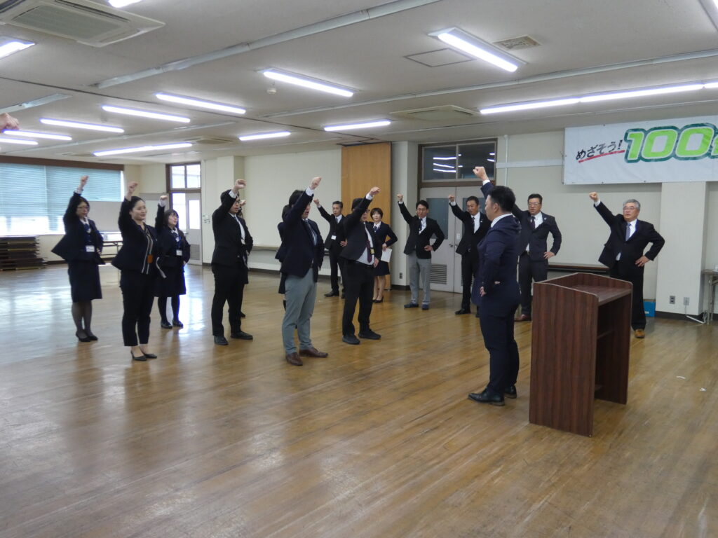 その後、山川聡一朗職員がJA共済の使命を発表、岡田愉菜職員が決意表明、下條祥平職員が音頭をとり、全員でガンバロー三唱を行い、本年度の共済事業推進のスタートを切りました。