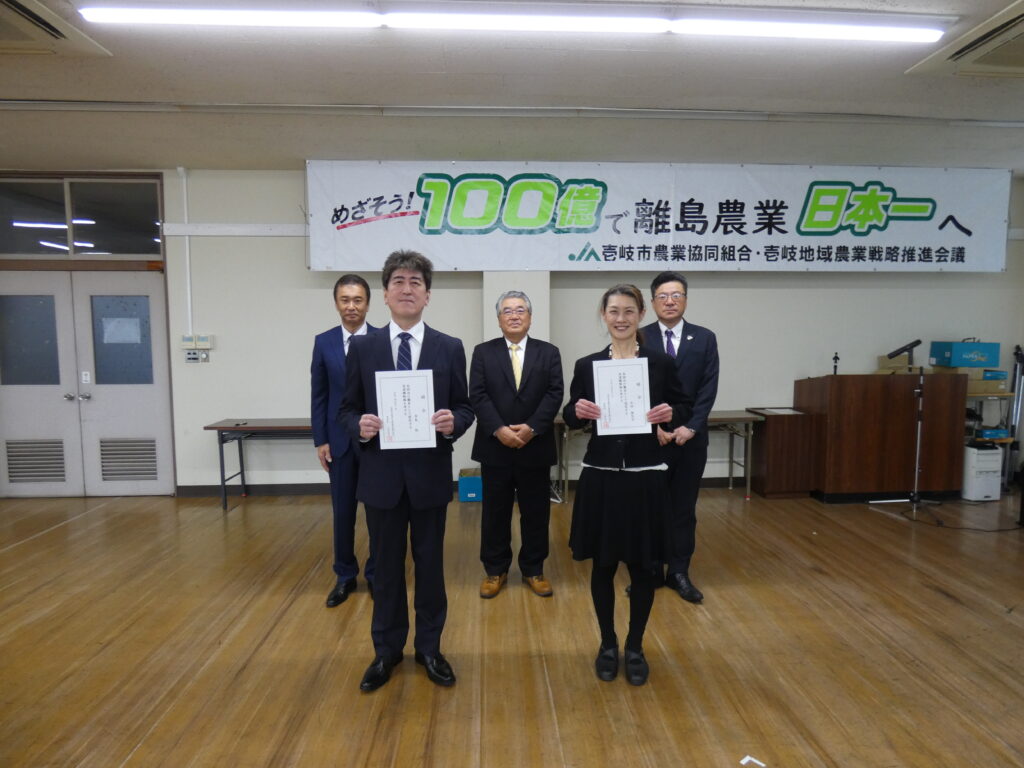 壱岐市農業支援事業協同組合は4月1日、JA壱岐市本所で2026年度農業版マルチワーカーの辞令交付式を行い、宮城県出身の北住亜矢子さん(52)と千葉県出身の寺島聡さん(53)の2人が採用しました。